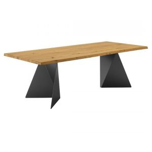 Mesa com estrutura em aço lacado, tampo em mármore ou carvalho maciço nas opções abaixo.