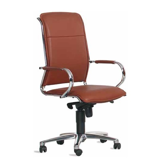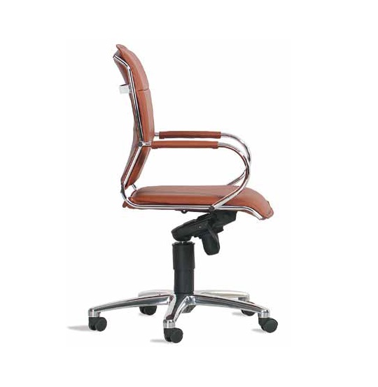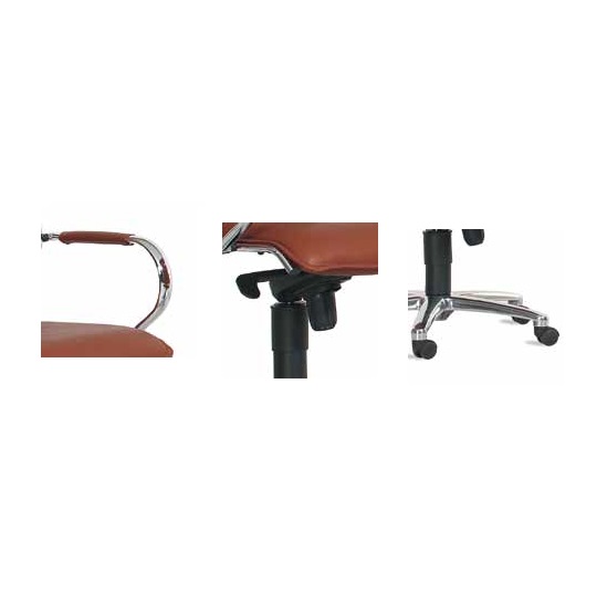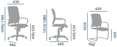 Linha de cadeiras disponível em três opções, com rodas de costas altas, com rodas de costas médias e em cadeira de apoio. Costas e assento em espuma moldada estofada. Estrutura em alumínio polido e braços metálicos fixos com acabamento cromado e revestimento no topo. Mecanismo “Syncron” com bloqueio de oscilação em 4 posições e tensão da inclinação ajustável.