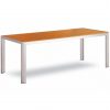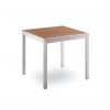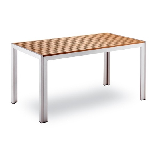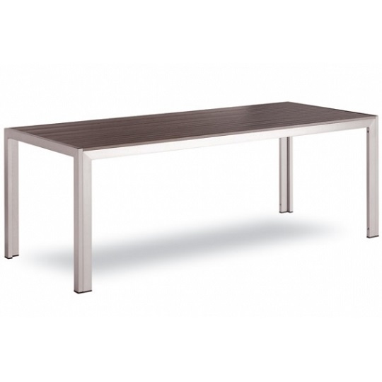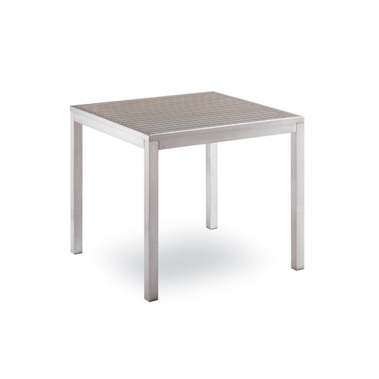 Mesa com estrutura em alumínio pintado a epóxi, tampo em ripas de alumínio a imitar madeira nas cores teka e cinza. Disponível nas medidas 80×80, 150×80 e 200x80cm.